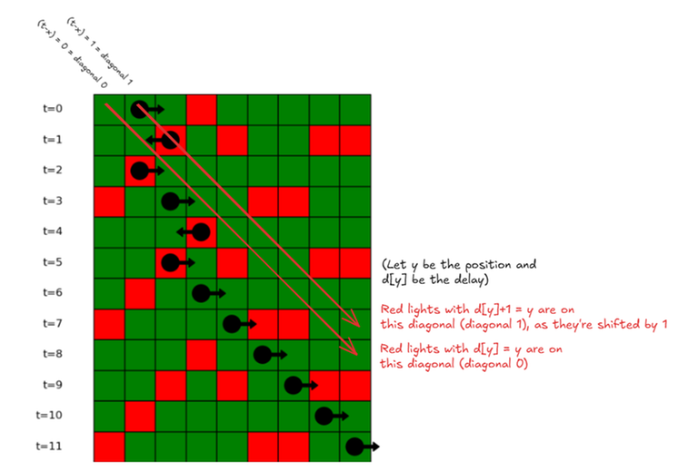 Here is my submission: https://mirror.codeforces.com/contest/2118/submission/324142498 You just need to maintain reverse flag, and go forward or backward to next light (depends on reverse flag), maintain time variable to decide whether you need to reverse or not on current light and also visited array, so when you visit same light twice with same reversed flag, you are in loop and the answer is no. And when you are on lights array index which is out of range, then the answer is yes.